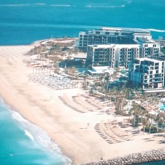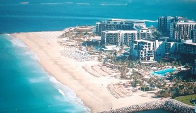 Bluewaters Island extends into the Persian Gulf with residential buildings, hotels, retail spaces, and restaurants spanning across its carefully planned layout.