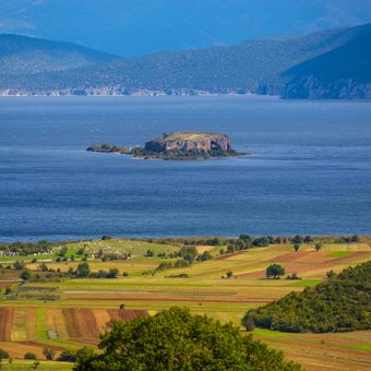 The region contains archaeological evidence from the Bronze Age, Iron Age, and medieval periods, including Byzantine churches and prehistoric settlements near the lakes.