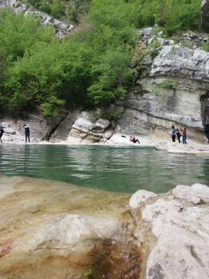 The Syri i Cikllopit formation consists of a deep rock pool measuring 20 meters in width and 120 meters in depth within the Krraba gorge.