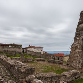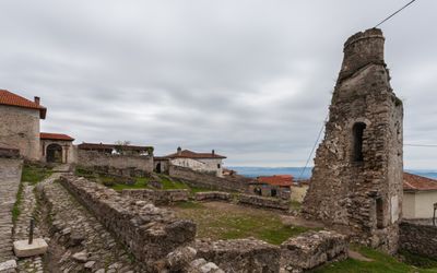 The Fethiye Mosque features a large central dome with remnants of a minaret near the entrance of the Skanderbeg Museum within Krujë Castle.