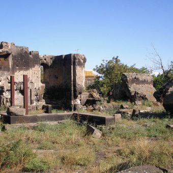 The Targmanchats Vank monastery features stone walls and sections of the eastern wings that remain standing among the fallen structures.