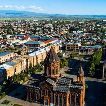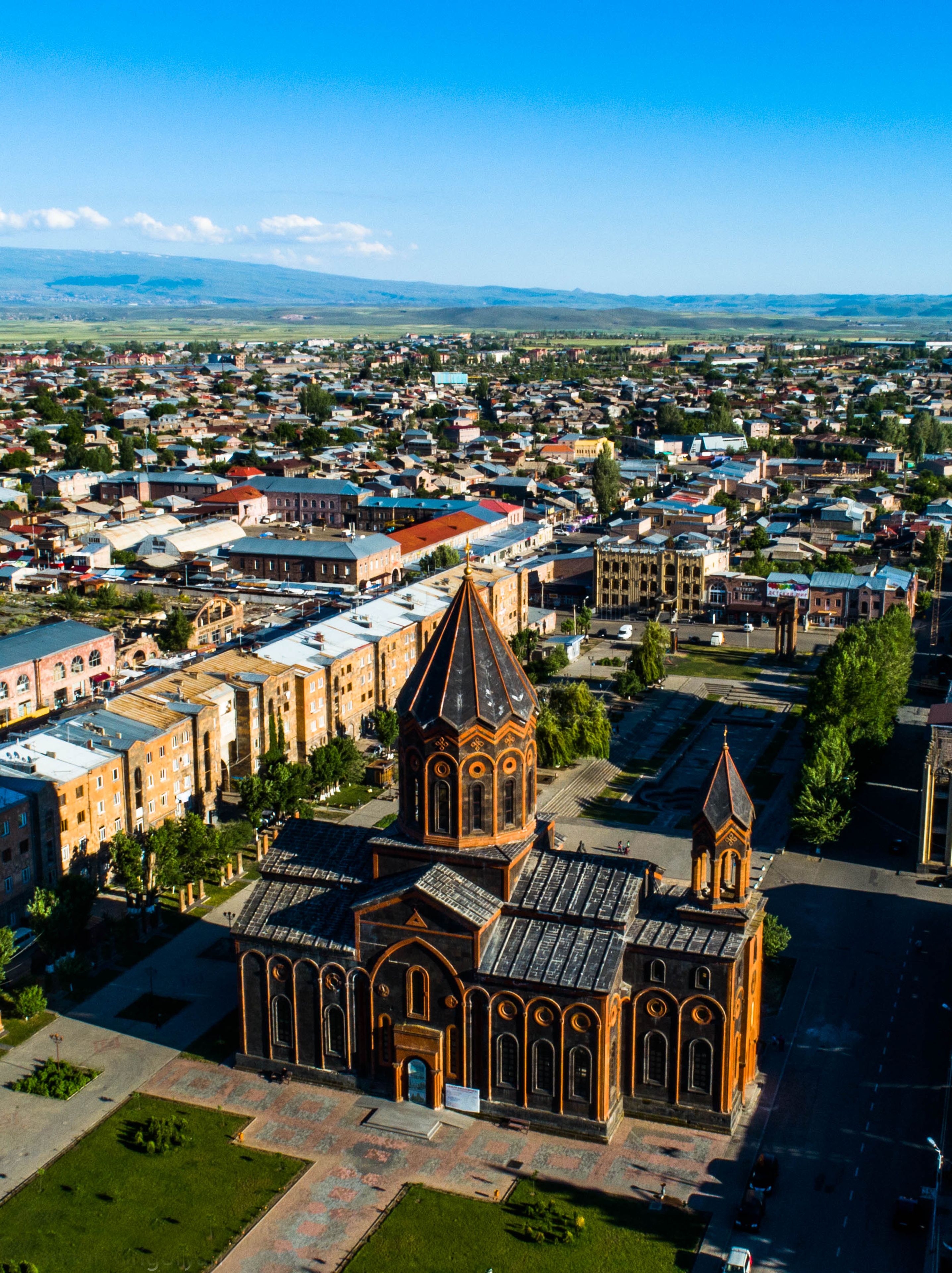 The Holy Saviour Church features a domed basilica design reaching 36 meters in height and stands as a central structure in Gyumri's main square.