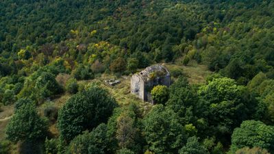 Tejharuyk Monastery is a medieval monastery on a wooded hill near Meghradzor, surrounded by low stone walls. It features a basilica with a main hall, gavit, side chapel, and portico entrance arranged in a traditional layout.