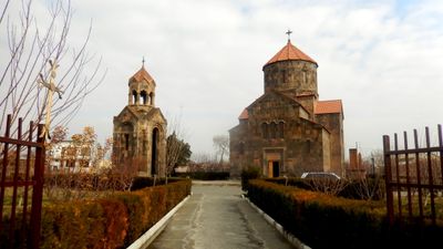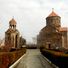 The Holy Cross Church features traditional Armenian architectural elements with a central dome and sacristies positioned on both sides of the nave.