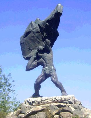 The statue depicts a figure holding a rock fragment above his head, representing the mythological character of extraordinary physical power.