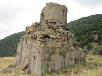 Mayravank is a monastery in Solak, Armenia, built on elevated ground with a stone church featuring a central dome and rectangular side structures. The complex includes remains of supporting buildings arranged around the main church.