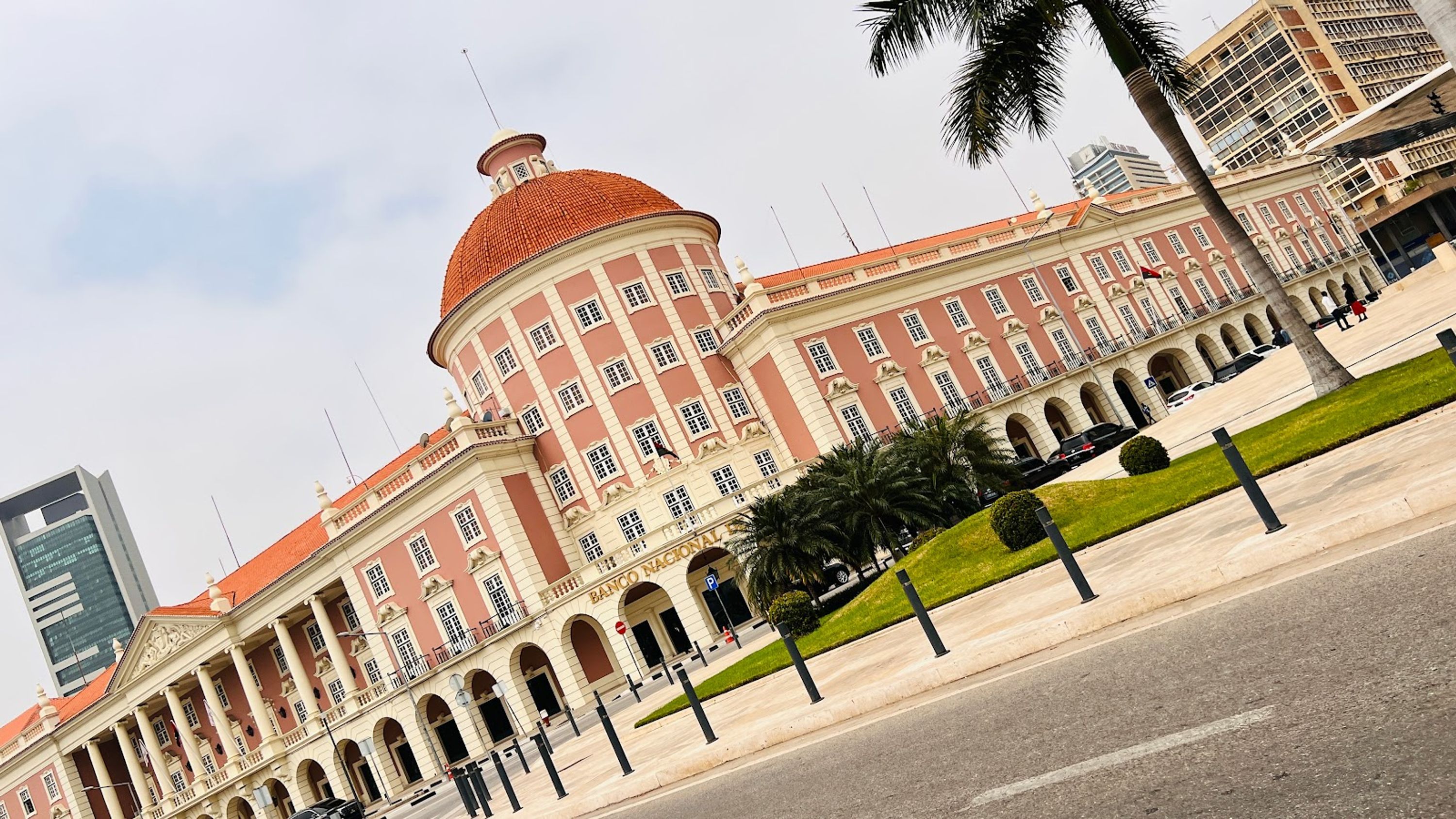 The National Bank of Angola operates from a concrete building with a central dome, marble interiors, and decorative woodwork throughout its floors.