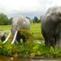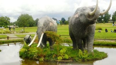 The Pleistocene Park features life-size replicas of prehistoric animals including gomphotheriums, saber-toothed cats, South American horses, and mylodons in natural settings.