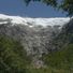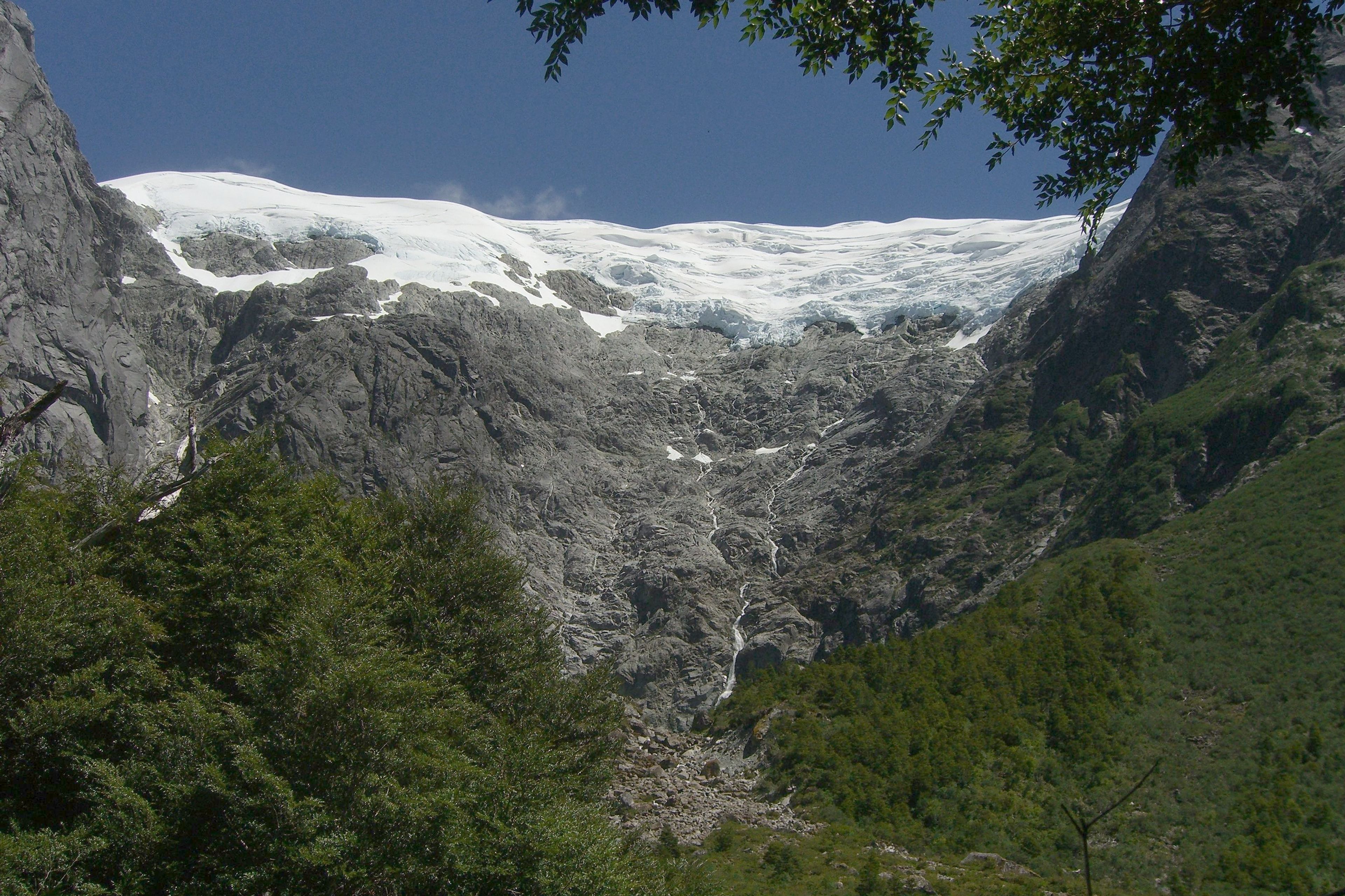 The Queulat Hanging Glacier creates a waterfall dropping directly into the Témpanos River, formed by melting ice from an elevation of 1,889 meters.