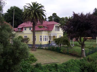 The property features a wooden waterfront promenade and gardens containing both Chilean native plants and species introduced by German settlers.