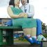 The monumental concrete sculpture depicts a couple sitting together, with the man wearing blue pants and white shirt, while the woman wears a green dress.