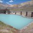 Natural thermal pools situated on a hilltop provide views of an abandoned hotel, while the surrounding valley hosts seasonal cattle grazing activities.