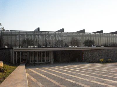 The structure combines concrete, glass, and metal elements to create a modern architectural design that can accommodate up to 4,500 visitors.