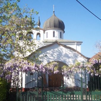 The temple conducts Divine Liturgy every Sunday at 10:30 AM and Vespers on Saturdays at 6:00 PM, with contact available through email or telephone.