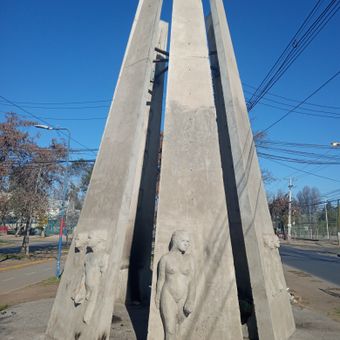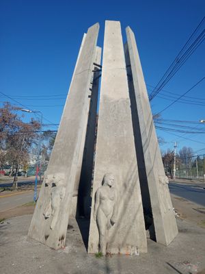 The Villa Francia Memorial stands at the intersection of Avenida 5 de Abril and Curacaví Street, featuring concrete and steel structures designed by sculptors.