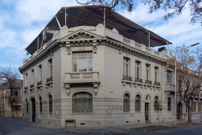 The Palacio Concha features symmetrical architecture with French-style windows, detailed moldings, and high ceilings spanning 1500 square meters in central Santiago.