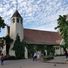 The church features Tudor architectural elements with an octagonal bell tower reaching 15 meters and pointed arches on lower windows and doors.