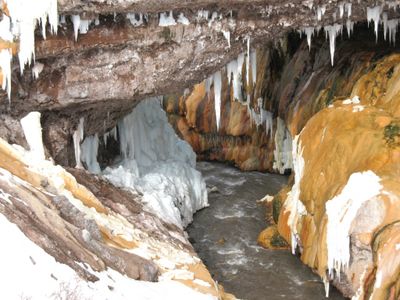 Puente del Inca is a natural limestone bridge that spans the Las Cuevas River at an elevation of about 2,735 meters (8,973 feet). The bridge displays a distinctive yellow-orange color created by mineral deposits that have accumulated over time.