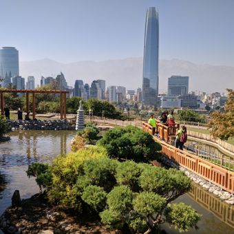 From the garden's viewpoint, visitors observe Santiago's financial district Sanhattan, with Costanera Center's Gran Torre Santiago in the background.