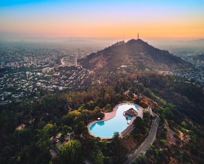 The pool's location within Metropolitan Park offers swimmers panoramic views of Santiago's cityscape while they enjoy the water facilities.