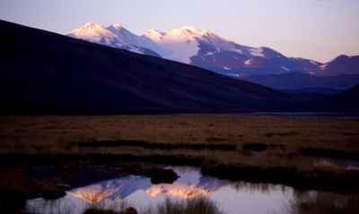 The Glaciar de los Argentinos extends across the northeastern slope of Mount Pissis at an elevation of 4,600 meters in the Atacama Andes range.