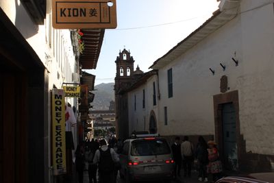 The street shows how Spanish colonizers built directly over existing Inca structures, visible in the facades and foundations throughout the space. Residents and visitors now walk past this layering of two distinct worlds as part of daily life.