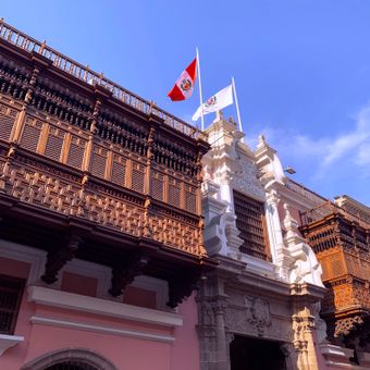 Torre Tagle Palace is a Spanish Baroque city residence in central Lima featuring two carved wooden balconies of different sizes, stone porticos, and the Tagle family coat of arms. The building now serves as Peru's Ministry of Foreign Affairs and displays elaborate facade work and an interior layout typical of colonial city palaces.
