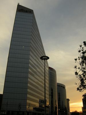 The Chocavento Tower rises to 107 meters with 25 floors above ground and 5 underground levels in the financial center of Lima.