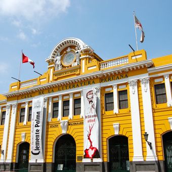 The Casa de la Literatura Peruana occupies a three-story building with a symmetrical facade featuring classical pilasters and a glass-covered central space.