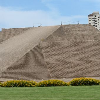 The pyramid walls consist of small, hand-molded adobe bricks arranged in trapezoidal patterns to withstand seismic activity in the region.