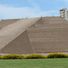 The adobe pyramid rises 12 meters high with three platforms connected by a wide ramp at the front of the structure.