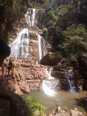 The waterfall's natural pools contain emerald green waters and stone bottoms, creating safe swimming areas with depths averaging 2 meters.
