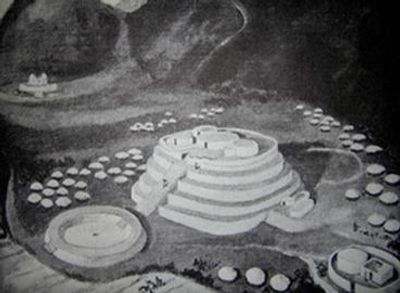 The site contains circular buildings with central furnaces inside pyramidal structures, displaying multiple construction phases that indicate long-term architectural development.