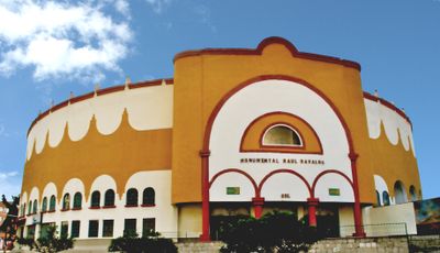 The Raúl Dávalos Bullring features wooden grandstands and covered seating areas, accommodating up to 13,000 spectators for traditional bullfighting events and performances.