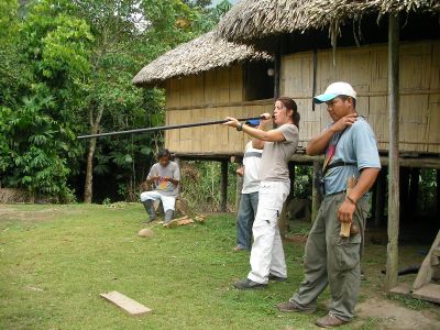 The park contains facilities along the Napo River, including interpretative centers, cabins, and trails maintained by local communities of Añangu and Nueva Providencia.