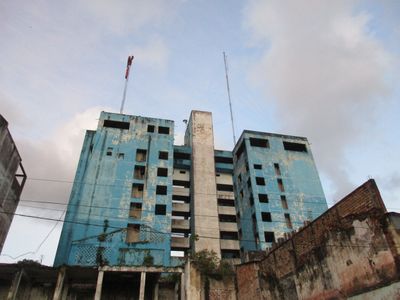 These twin brutalist towers from 1969 rise above central Iquitos with concrete facades showing signs of structural instability that forced their eventual abandonment.