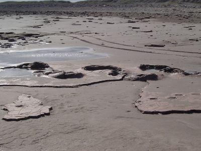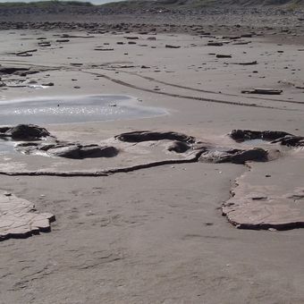 The archaeological site contains human footprints from 7000 years ago, preserved in clay sediments alongside marine shells and stone artifacts.