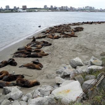 The sea lion reserve extends along the port area, providing a natural habitat for a colony of South American sea lions within an urban setting.