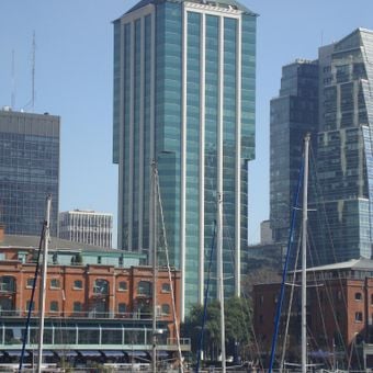 The Torre Bouchard rises 110 meters with 30 floors of glass and steel architecture, marking its presence in the Buenos Aires financial district.