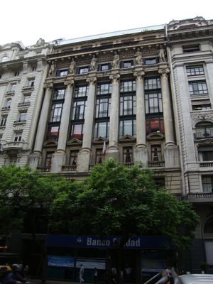 The building houses various offices, including the Chilean Consulate on the second floor and a Banco de la Ciudad branch at ground level.