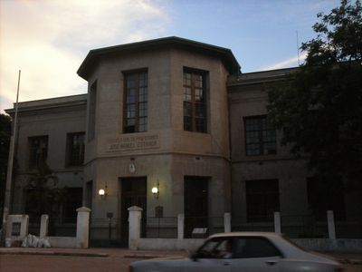 The Escuela Normal José Manuel Estrada is a teacher training school in Corrientes featuring a main building with a polygonal entrance and two lateral wings housing classrooms, workshops, and administrative areas. Additional facilities include physics and chemistry laboratories, an auditorium, and a Natural History Museum located at Sargento Cabral 2120.
