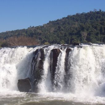 Moconá Waterfalls are a series of falls that run for three kilometers along the Uruguay River in Misiones Province, Argentina, where water drops between five and seven meters into a parallel canyon. The main flow occurs within a long fault in the riverbed, with the water level on either side of the crack differing in height.