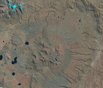The mountain features a 40-kilometer diameter ignimbrite shield surrounding a semicircle of lava domes, with minimal erosion creating formations similar to Martian landscapes.