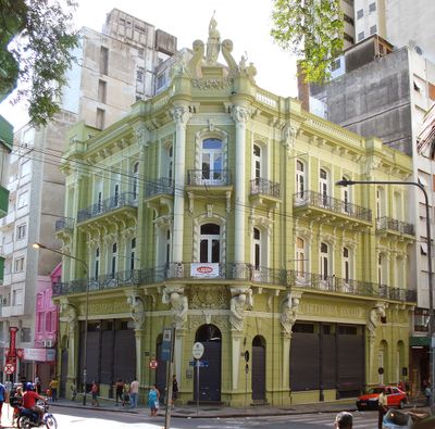 Located at the intersection of Riachuelo and Dr. Flores streets, this four-story building features Atlas sculptures and iron beams with brick masonry construction.