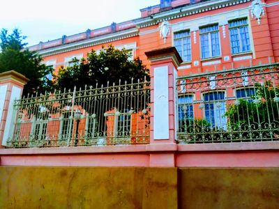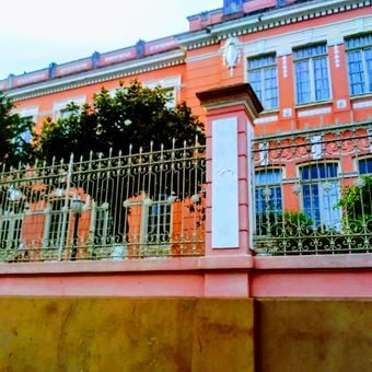 This two-story educational institution features a classical architectural design with rectangular windows, cornices, and decorative plasterwork on both floors.