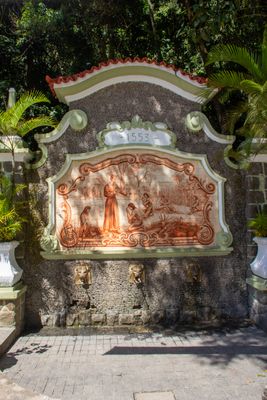 The fountain's cliff face contains Portuguese mosaic tiles that illustrate the educational interactions between Jesuit missionaries and indigenous communities.