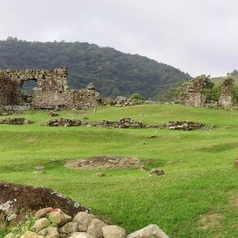 The Engenho dos Erasmos complex includes remains of a sugar production facility with stone walls, administrative buildings, and a water wheel system.