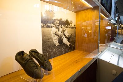 The museum contains personal artifacts such as a football made from socks and a shoeshine box, along with an interactive space to compare skills with Pelé.