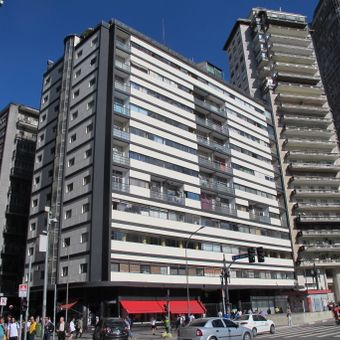 The Edifício Esther is a modernist building in República District with ten floors holding 103 residential and commercial units in a functional design. The structure combines apartments of varying sizes, office spaces, and a rooftop restaurant, mixing different purposes within a single structure.