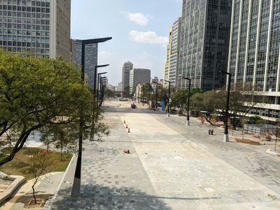 The Vale do Anhangabaú extends across 43,000 square meters between Viaduto do Chá and Santa Ifigênia viaducts in downtown São Paulo.